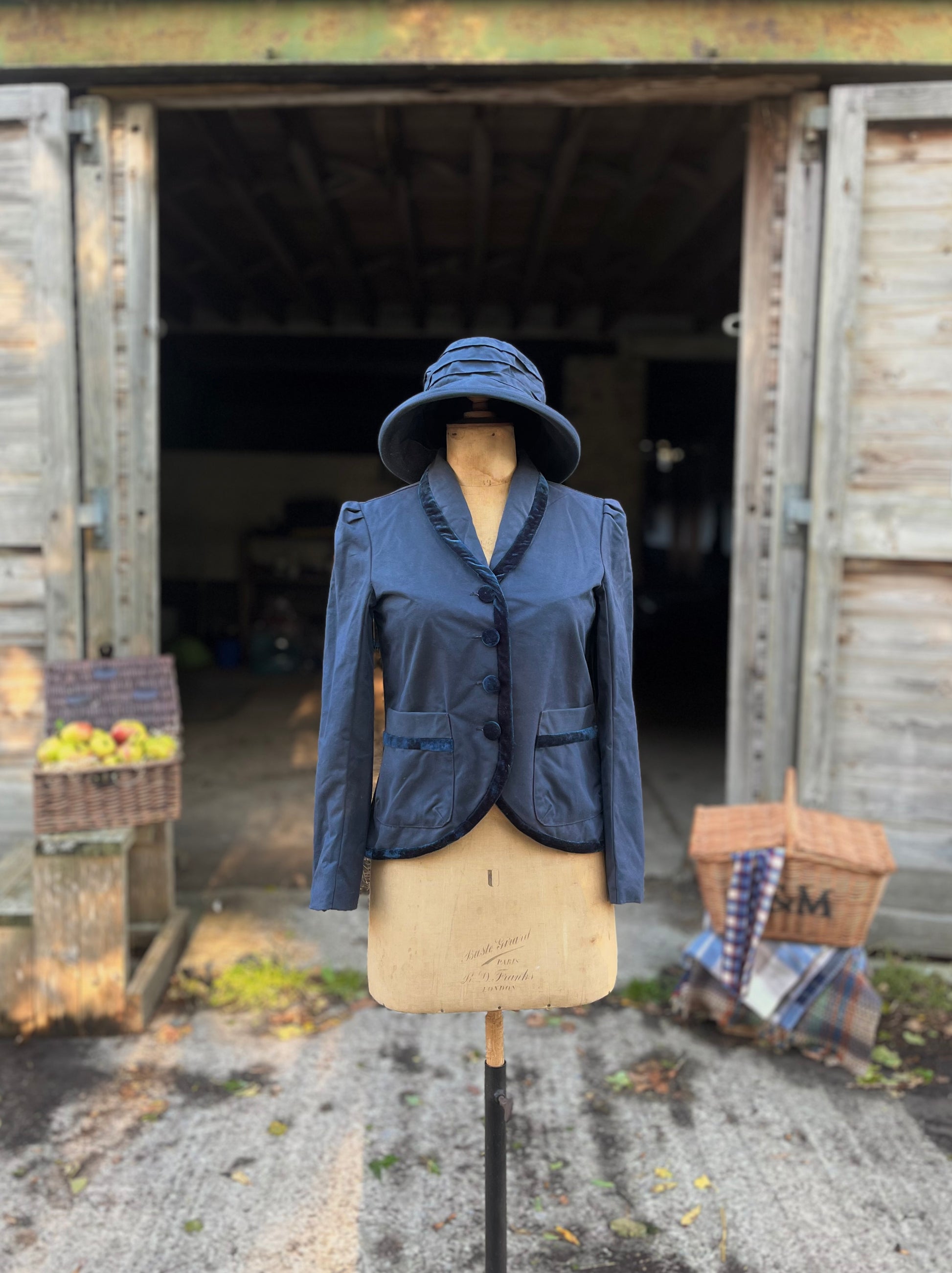 Waxed cotton, with velvet trim and buttons.